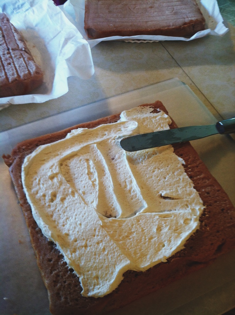 | Repeat process with third layer | Cut off excess cake to even the top |